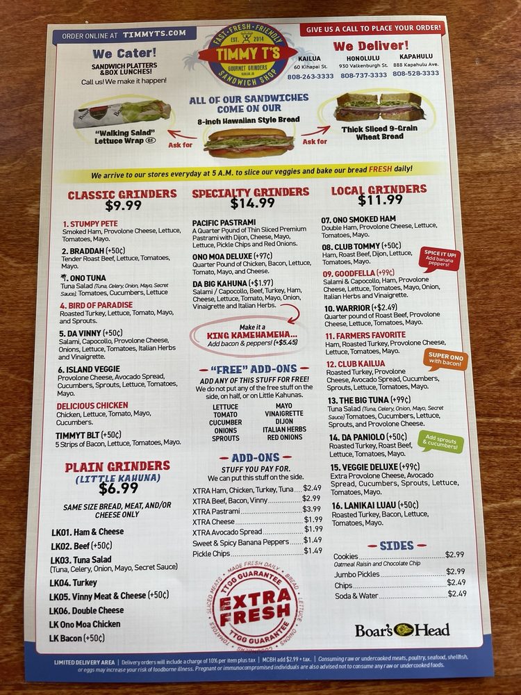 Overall, Timmy T's Gourmet Grinders Sandwich Shop is a testament to exceptional sandwich-making with a local twist. Each visit promises not just a meal but a flavorful journey that showcases the best of what Kailua has to offer. Don't miss out on this culinary delight during your next trip!