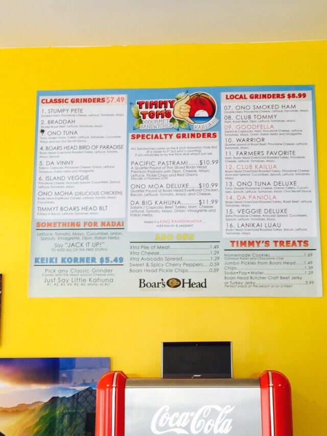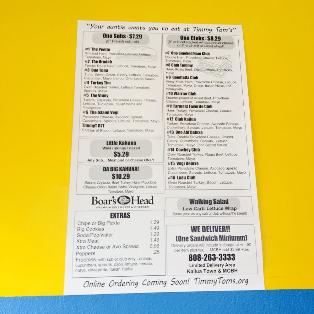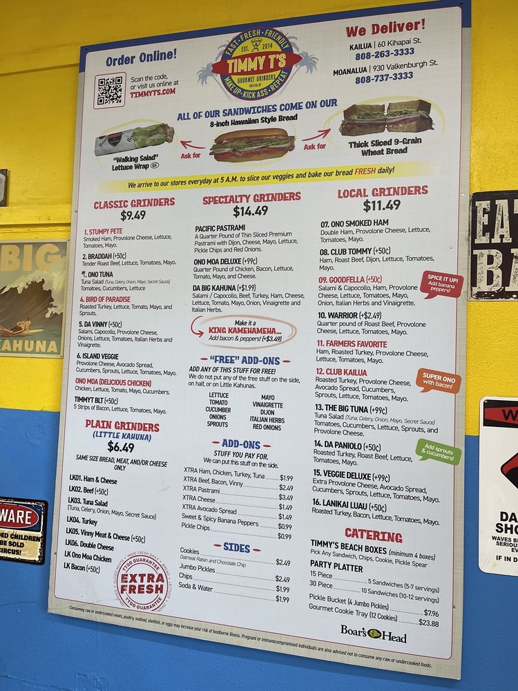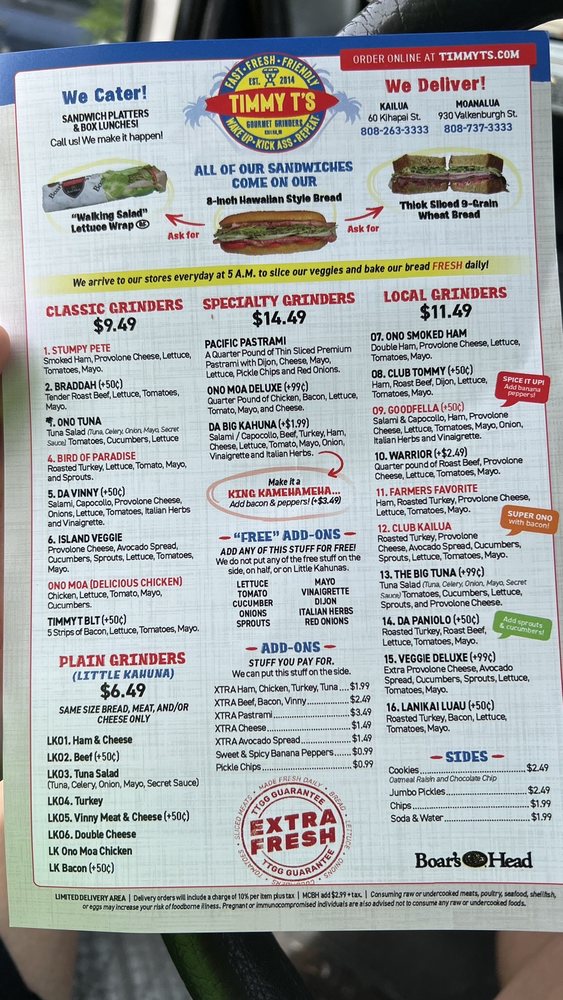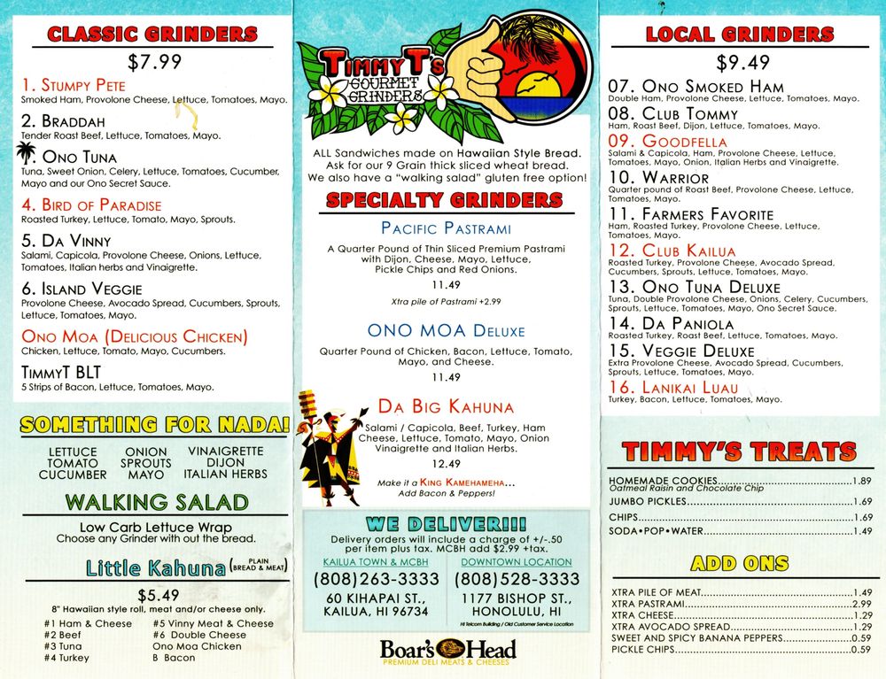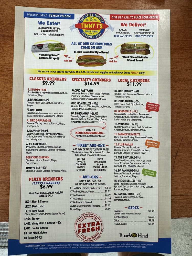 Welcome to Timmy T's Gourmet Grinders Sandwich Shop, where every sandwich is a masterpiece! Nestled in the heart of Kailua, Hawaii, this shop specializes in crafting beautiful grinders that are sure to tantalize your taste buds. The menu showcases an array of specialty grinders, including the OMD Ono Moa Deluxe and the King Kamehameha, each bursting with flavor. For those craving simplicity, plain grinders like the classic ham and cheese or the flavorful tuna showcase fresh ingredients at their finest.